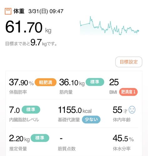 お通じ後計量。 まあ、こうなるわな。 生理前の眠気が凄過ぎて 今朝は9時過ぎまで目が開かなかった。 😓 今も眠い… ヶド、今日は歩きに出る。 出たら出たで花粉やばいんだけど…苦笑